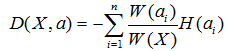 因为每个分支结点的个数不一样,因此我们计算“总熵”时应该做一个加权,假设第i个结点样本个数为W(ai),其在所有样本中的权值为W(ai) / W(X)。所以我们可以得到一个总熵: