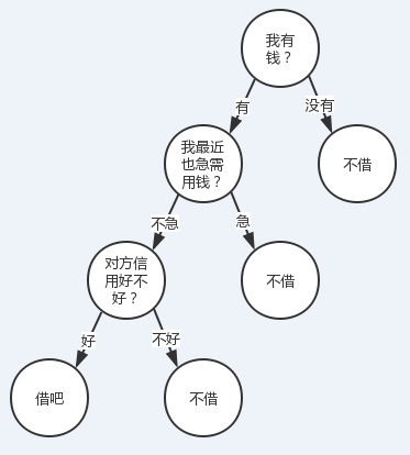 有人找我借钱(当然不太可能。。。),借还是不借?我会结合根据我自己有没有钱、我自己用不用钱、对方信用好不好这三个特征来决定我的答案。