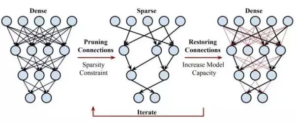 图 5:DSD(Dense-Sparse-Dense)训练法中迭代进行剪枝和恢复权重的过程。