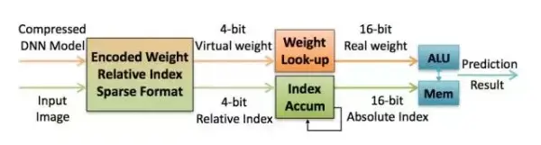- 权重编码:EIE 是第一个用非统一量化、极窄权重(每个权重 4 比特)利用查找表执行推断的加速器。与 32 比特浮点相比,它获取权重节约了 8 倍的内存占用,与 int-8 相比,它节约了 2 倍的内存占用。