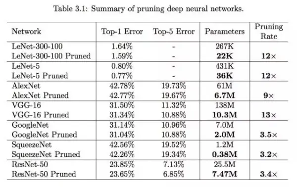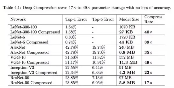 表 4.1:深度压缩在没有准确度损失的情况下节约了 17 倍到 49 倍的参数存储需求。