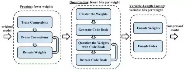 图 4.1:深度压缩的流程:剪枝、量化学习和可变长度编码