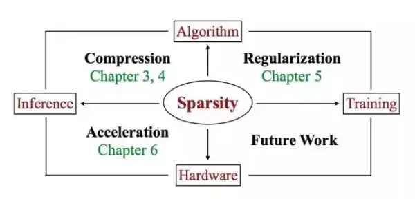 本文从三方面研究如何提高深度学习的效率:利用深度压缩实现更小的模型大小、利用 DSD 正则化实现更高的预测准确度,以及利用 EIE 加速实现快速、能耗低的推断(图 7.1)。这三个方面遵循相同的原则:利用神经网络的稀疏性进行压缩、正则化和加速。