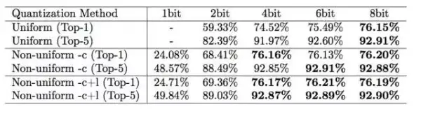 图 4.10 和表 4.9 比较了均匀量化和非均匀量化的性能。非均匀量化指的是相邻编码的距离不为常数。量化训练是非均匀量化的一种形式,因为其不同编码的距离并不相同。对于非均匀量化(本研究),基线 ResNet-50 所有层级的参数可以压缩为 4 比特而没有准确度损失。然而对于均匀量化,基线 ResNet 所有层的参数只能压缩到 8 比特而没有准确度损失(压缩到 4 比特会产生 1.6% 的 Top-1 准确度损失)。非均匀量化可以很好的捕捉到权重的不均匀分布,而均匀量化不能很好的实现这一点。