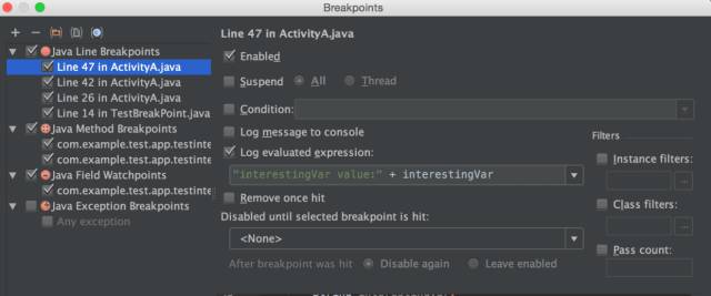 上面介绍了这么多给力的功能,其实还有很多细节;打开断点设置窗口(Run -> View Breakpoint`):