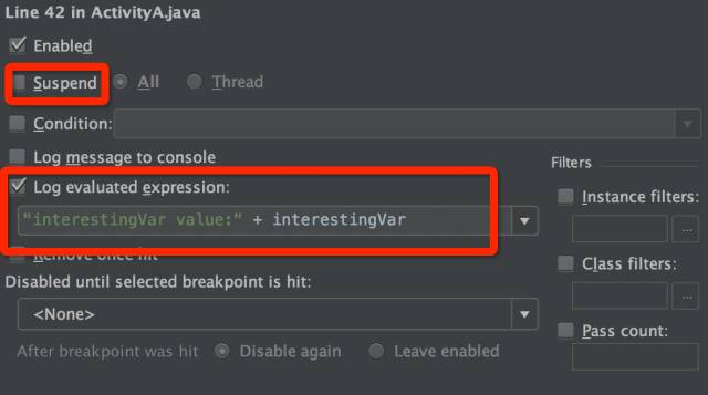 首先我们在想要输出信息的地方下一个断点;然后右键这个断点,在出现的设置框里面把这个断点的 suspend 属性设置为 False ,这样虽然叫做“断点”,但是并不会真正断下来;然后,我们在 log message 里面填上我们想要输出的日志信息。如下图(注意标红位置):