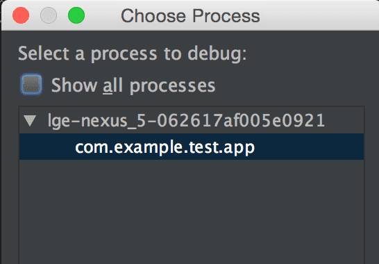 一般来说我们有两种办法调试一个debuggable的apk;其一是下好断点,然后用debug模式编译安装这个app;其二是 attach process,在Android Studio里面就是这么一个对话框: