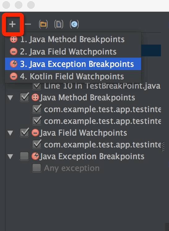 在上面我们添加异常断点的时候,点击加号的时候,有四个选项;第一个就是我们前面所说的第二种方法断点的添加方式,第三个是异常断点,那么第二个 Field WatchPoint 是干什么的呢?