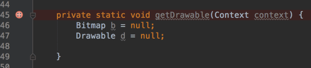 传统的调试方式是以行为单位的,所谓单步调试;但是很多时候我们关心的是某个函数的参数,返回值;(回想一下我们使用日志的时候打印的最多的信息难道不是函数的参数和返回值吗?)使用方法断点,我们可以在函数级别进行调试;如果经常跳进跳出函数或者只对某个函数的参数感兴趣,这种类型的断点非常实用。具体使用方法有两种方式;最简单的是在你感兴趣的方法头那一行打上断点,这时候你会发现断点图标有点不一样,这就是方法断点了,如下图:
