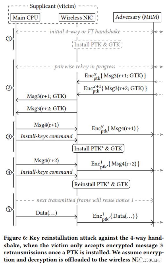 在实践中,我们发现一些AP确实接受具有旧的重传计数器的数据包。更确切的说,一些AP接受在被发送给Client数据包中使用,并且还未被Client发送回来的重传计数器。这些AP会接受旧的未加密的Message 4,就是图4里的重传计数器r+1。总的来说,这些AP会装载PTK,并且开始发送加密的单播数据帧给Client。