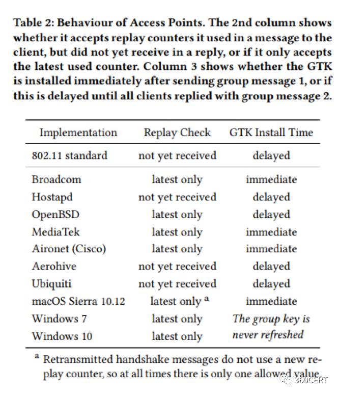 我们在一些延迟装载GTK的AP上进行了攻击测试,然后他们接受了先前在和Client发包时的还未收到回复的重传计数器(表2列2)。我们已经知道所有的Wi-Fi客户端会在重载GTK的时候重置重传计数器,因此他们都会被这种攻击所影响。最后,一个OpenBSD的AP并不会被影响,因为它是延迟装载GTK的,并且只接受最新的重传计数器而不是旧的。