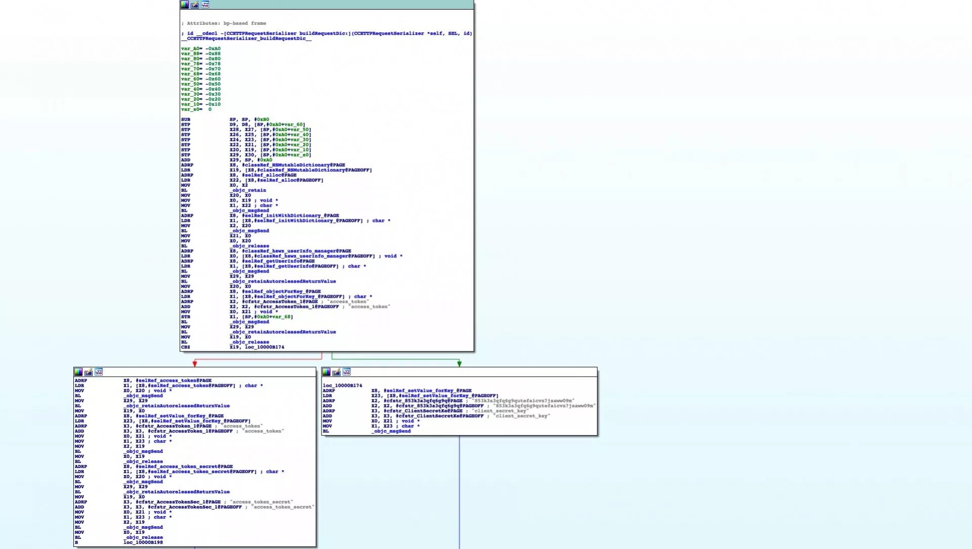 通过逆向工具(IDA)反编译出诸如上图的经过处理的类汇编代码,通过对代码的分析,我们可以轻松的知道客户端的key就是对应的上图中的client_secret_key字段,通过观察,这段代码虽然可以看出一些端倪,然而要正确了解数字签名的逻辑,并不是一件轻松的事,因此对于逆向工作来说,有很大一部分工作是猜测,当然是有根据的猜测,通过不断地猜测和验证,才能获得你想要的结果,这个过程可能很快,也可能很漫长,通过不断阅读分析、猜测和验证,我们得到一下的结论,该数字签名是通过将各个参数连同客户端key以键值对按key升序排序后用等号连接,再在其中间用&进行拼接进行sha256散列函数运算后得到,结果是这样的: