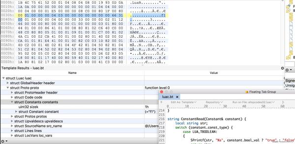 生成好Luac文件后,就是编写一个个结构体进行测试,这是纯体力活了。`luadec`提供了一个ChunkSpy52.lua,可以使用它打印Luac的文件格式内容,可以参考它的输出进行Luac.bt的编写工作,实际上我也是这么做的。