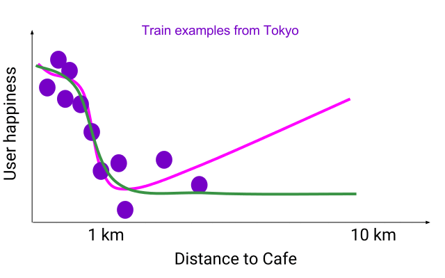 | 分割出模型中所有其他输入保持不变,只有距离发生变化的特征空间。在东京的训练示例(紫色)上准确的柔性函数(粉色)预测一家距离为 10 公里的咖啡店优于一家距离为 5 公里的相同咖啡店。如果数据分布发生变化,正如这里德克萨斯州的蓝色示例所示(德州的咖啡店分布较为分散),这个问题在测试时就变得更加明显了。 |