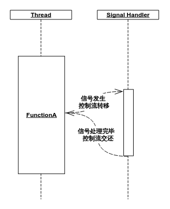 UNIX 信号处理是一个相当奇葩的过程——当进程收到一个信号时,内核会选择一条线程(以一定的规则),中断其当前控制流,将控制流强行转给信号处理函数,待其执行完毕后再将控制流交还给原线程。时序图如下:
