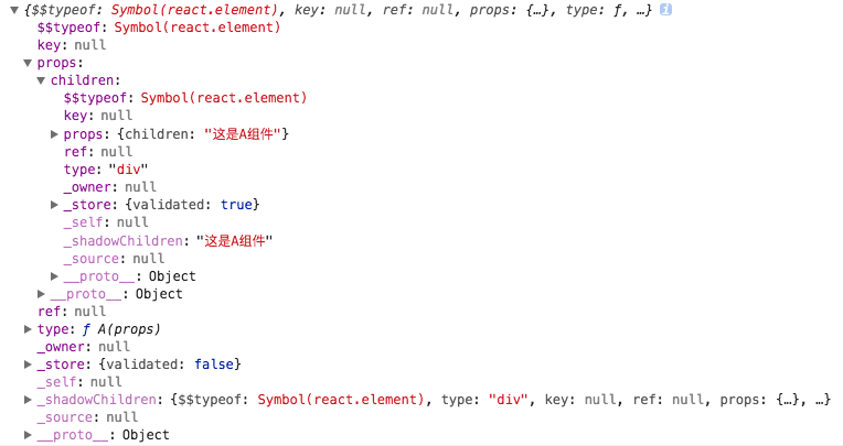 可以看出,<A />其实是js对象而不是真实的DOM,注意此时props是空对象。接下来,我们打印<A><div>这是A组件</div></A>,看看控制台会输出什么:
