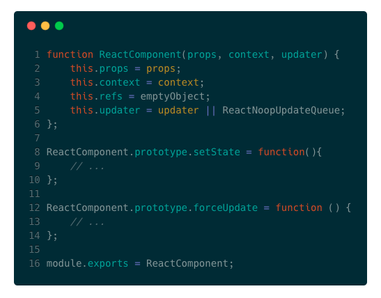 上述代码是再熟悉不过的构造函数,想必大家已经滚瓜烂熟了。同时我们也注意到setState是定义在原型上具有两个参数的方法,具体原理我们将在React更新机制的篇章讲解。