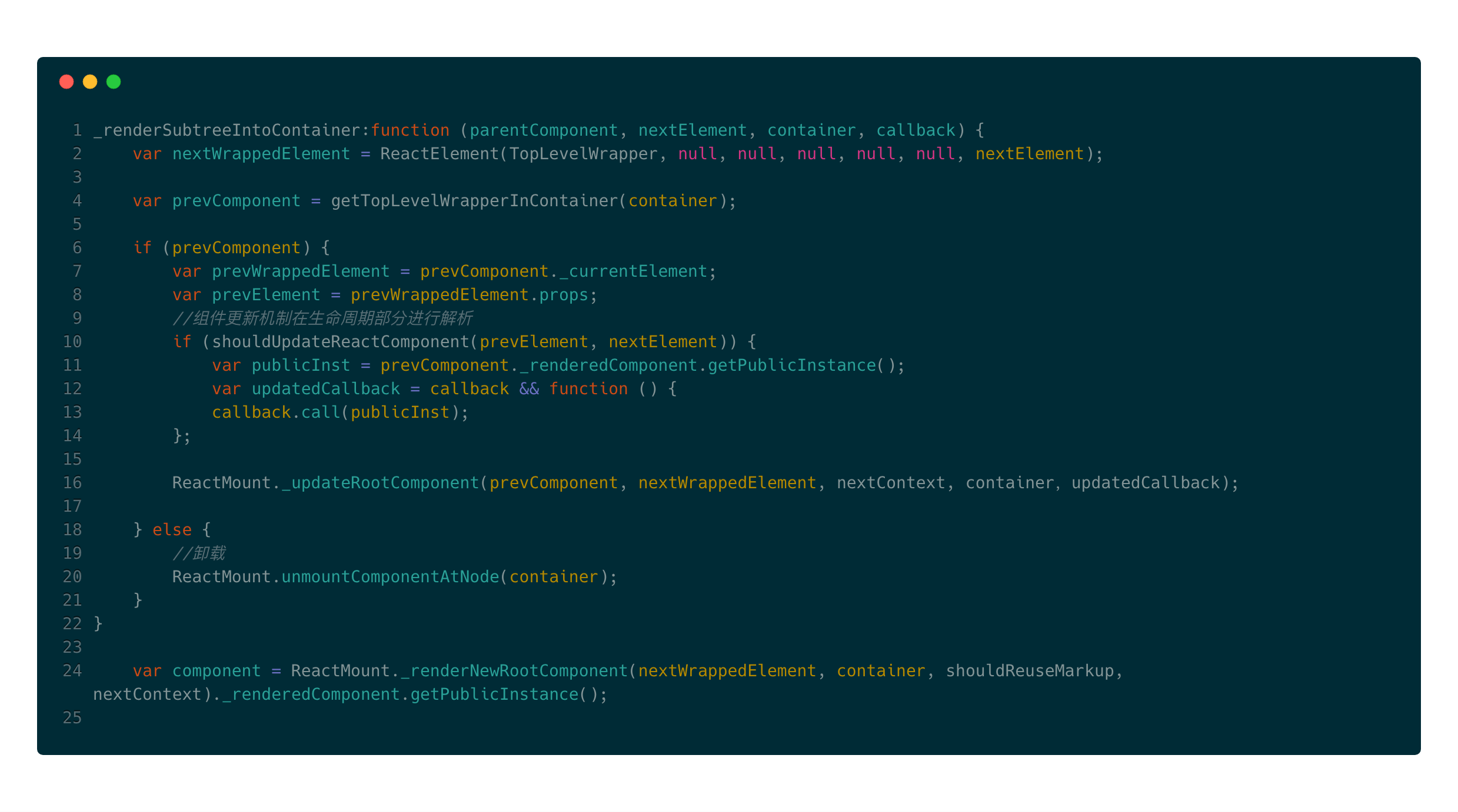 getTopLevelWrapperInContainer方法判断当前容器下是否存在组件,记为prevComponent;如果有即prevComponent为true,执行更新流程,即调用_updateRootComponent方法。若不存在,则卸载。(调用unmountComponentAtNode方法) - line 24:不管是更新还是卸载,最终都要挂载到真实的DOM上。看下