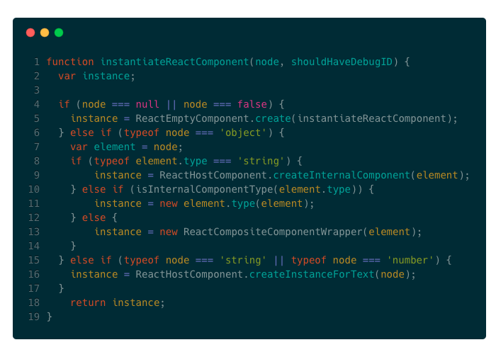 上文我们提到,在组件挂载的倒数第二步,也就是执行_renderNewRootComponent方法时,我们看到有一个名为instantiateReactComponent的方法返回一个经过加工的对象。我们看下instantiateReactComponent的源码: