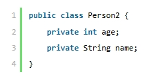 01 02 03 04 05 06 07 08 09 10 11 12 | public class Person2 { private int age; private String name; public Person2() { super(); } public Person2(int age, String name) { super(); this.age = age; this.name = name; }} |
