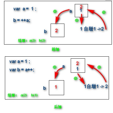 ++ : 分为前加和后加,当++在前,则先自增1再使用; 当++在后,则先使用再自增。以此类推 -- 同理。