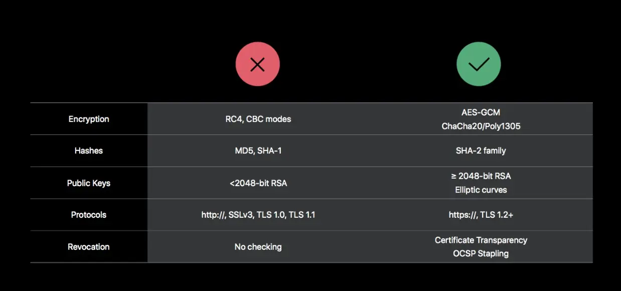 加密是我们众所周知的用来防止信息被窃听的手段,但是一些加密算法已经非常不安全,很容易被攻击者攻破。特别是 RC4, 目前可以在短短三天之内就可以攻破它。而且,Triple-DES 和 AES 加密算法在 BEAST 和 Lucky 13 这些攻击面前,也无法保证安全性。苹果正在计划在所有平台上弃用 Triple-DES 和 RC4,同时也不推荐使用 AES-CBC 算法,但是还没给出具体的日期。Apple 推荐我们使用 AES-GCM 或者 ChaCha20/Poly1305 算法。
