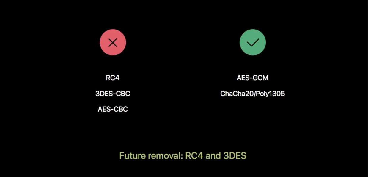 在 WWDC 上 Apple 阐述了 TLS 1.3 相比 TLS 1.2 的一些改变: