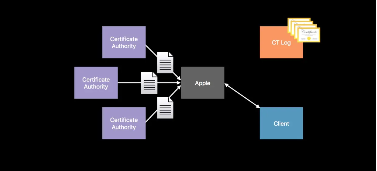 尽管 Apple 鼓励开发者在服务端采用 OCSP Stapling 这种方式,但是普及程度远远不够。Apple 同时宣布加强在所有平台的证书吊销验证。Apple 会从 Certificate Transparency log 中获取信赖的证书列表,开发者和CA都可以向 Certificate Transparency log 提交证书,提交的证书会受到监控和审计。然后 Apple 会从证书颁发机构查询证书的吊销状态,把所有吊销证书的信息捆绑到一起,每隔一段时间自动下发给客户端设备,这样客户端就可以周期性的验证证书的吊销状态了。