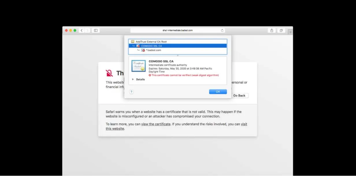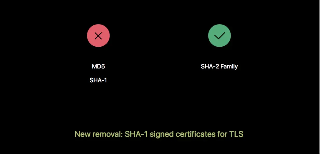 MD-5 和 SHA-1 已经不安全了,Apple 已经在前几年在移除了 MD-5 算法的签名证书。SHA-1 在今年的早些时候,也遭遇了攻击。所以,Apple 将也不再信任 SHA-1 算法的签名证书。为了保证绝对的安全,开发者应该使用 SHA-2 算法。