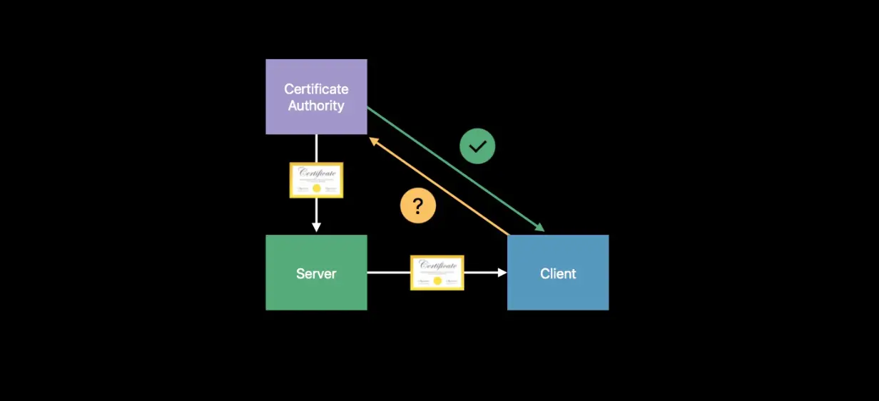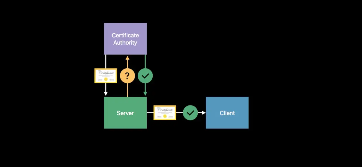 - 在线证书状态协议(Online Certificate Status Protocol,OCSP),OCSP 是这样工作的。首先,服务端会从 CA 申请一个证书,服务端会把证书发送给客户端作为验证,客户端为了验证服务端的身份会向 CA 发送一个请求,来获取该证书的吊销信息,CA 会返回该证书的状态给客户端。客户端根据返回结果来判断服务端的证书是否正确。可以看出来,OCSP 有明显的缺陷,客户端需要向 CA 发送额外的网络请求,这导致了它存在一些性能问题。并且 OCSP 是明文传输,会存在安全隐患。基于这两个原因,Apple默认不支持OCSP验证。如果开发者想启用 OCSP 查询,需要在 App 中集成其他API。