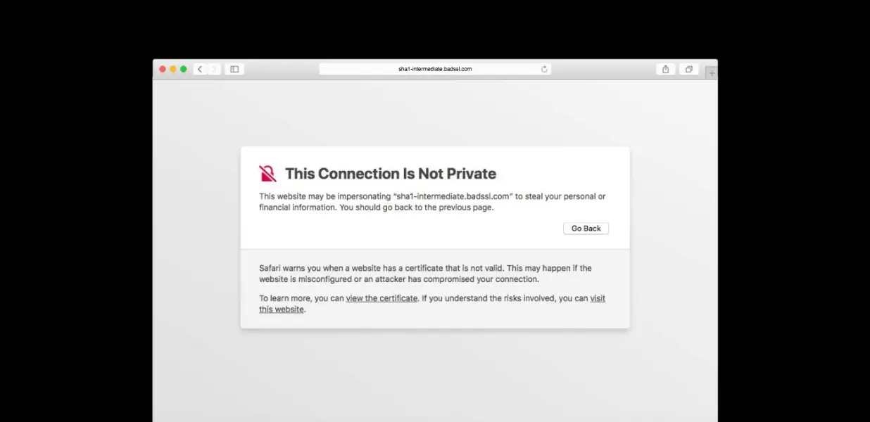 在 Safari 中重新设计了新的证书报错界面,如果你用了不符合要求的证书,那么将会看到如下界面。
