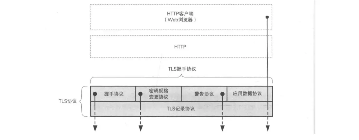 TLS 协议是由 TLS 握手协议和 TLS 记录协议两部分组成,TLS 记录协议负责对传输内容加密,TLS 握手协议又分为四个子协议,负责协商加密算法、共享密钥、传达警告等工作。