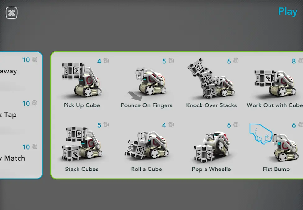 Cozmo自娱自乐玩腻了,会主动邀请你跟它一起玩游戏,就像你儿时玩伴那样。cozmo随身携带的三个积木,将成为你们的游戏道具,你们将狭路相逢,比拼记忆力或反应速度,调动你的肌肉和大脑,记得当心Cozmo的小心思!它可是会耍诈的