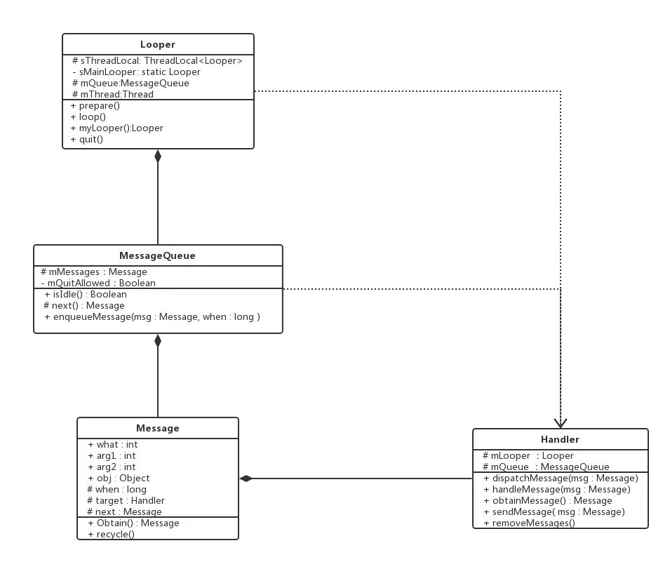 Android线程间的消息机制最常用的就是用Handler来实现,而Handler的实现还需要借助Looper、MessageQueue、Message这三个类,下图为这4个类之间的关系