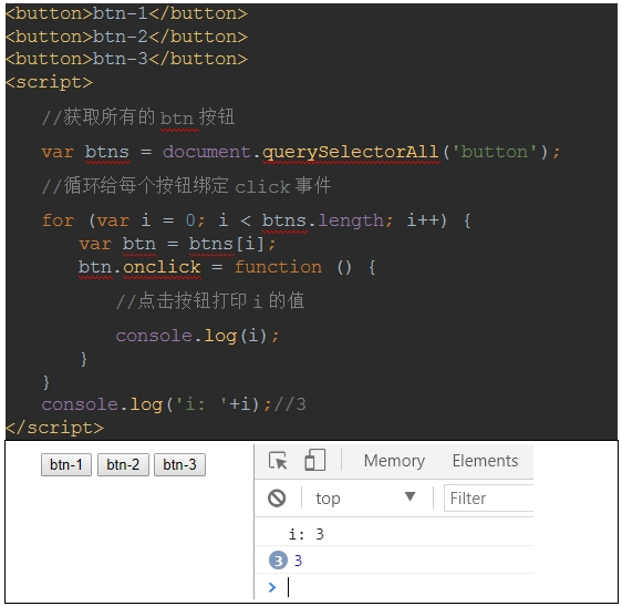 在这个例子中,点击这3个按钮打印的都是:3,原因就是此时的i是一个全局变量i,按钮只是拿到了i的引用。也就是说按钮的i指向的同一个对象i,那么i的变化会同时影响到这三个按钮。i进过训话后变成了3,所以点击按钮打印出来的就都是3了。