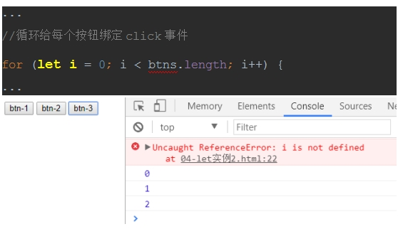在代码中只用把 var i 改成 let i 即可,现在在for循环外打印i已经获取不到了,i已经不再是全局变量。此时点击按钮看到打印的结果为:0 1 2 ,达到了我们的预期。