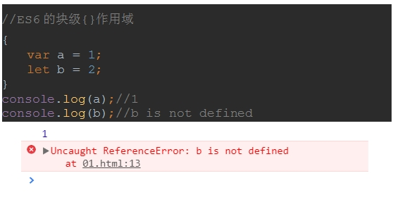 在花括号中用var声明了一个a变量,用let声明了一个b变量。在花括号之外访问时,a可以正常访问到1,但是b却不能。原因是let声明的变量超出{}之后,就访问不到了。