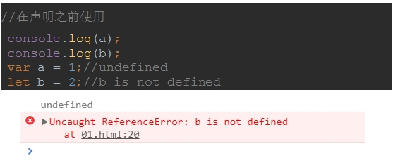 使用let时,必须先声明再使用,如果在声明之前使用就会报错,用var时则会显示undefined。
