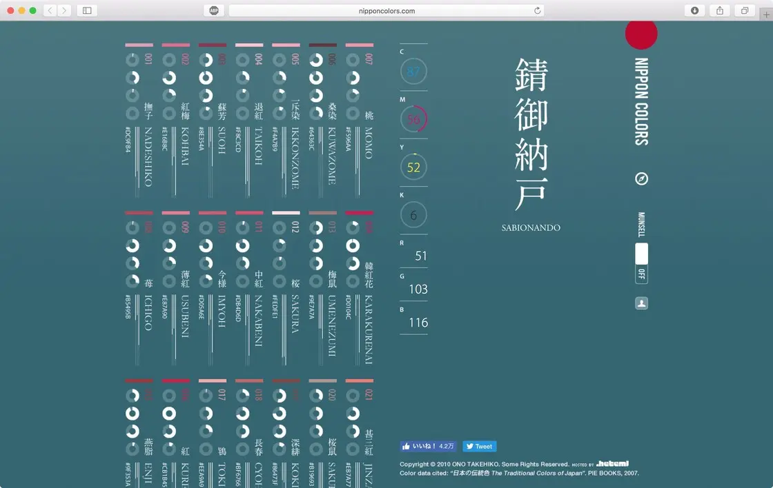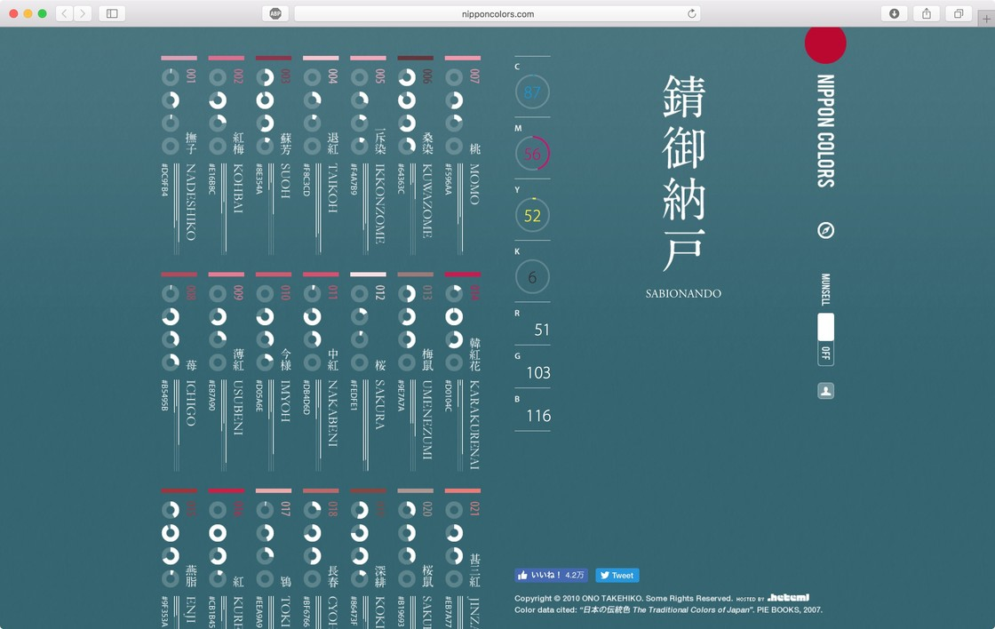 Nippon Colors 是一个日本传统色系的网站,总共收录了 250 种颜色,并标注了每种颜色的名称。如果想要做一些日系设计,可以来这个网站寻找下,有没有你想要的颜色。