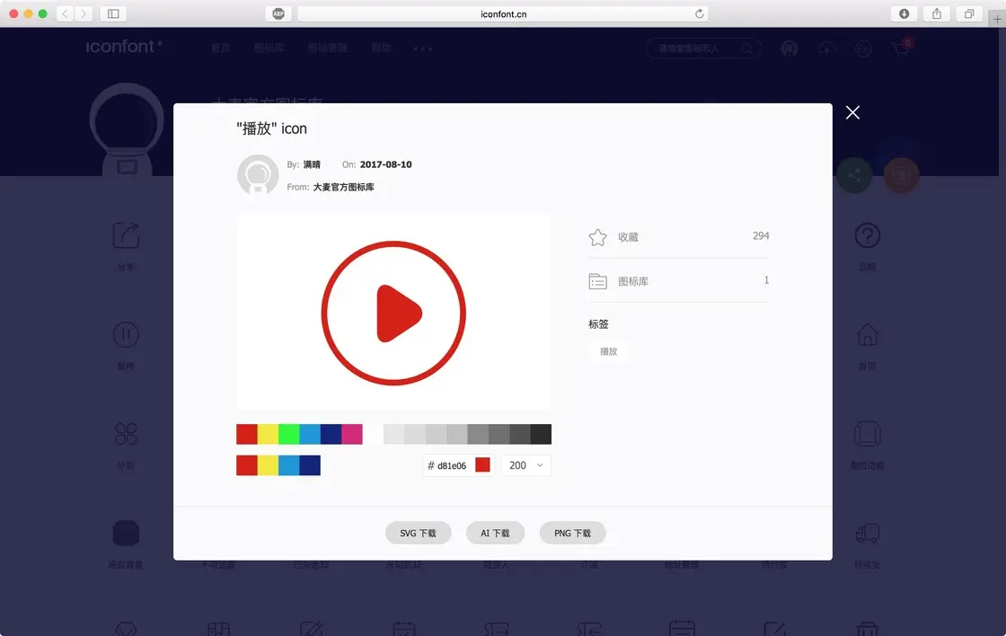 可以单个下载和批量下载 icon,下载的 icon 格式包括常用的 SVG,AI,PNG,同时还可以对下载的素材颜色进行自定义。批量下载时,将喜欢的 icon 加入购物车,再点击网站右上角的购物车,就可以批量下载了,批量下载还可以下载对应的 icon 代码,供 WEB 前端,iOS,Android 平台的工程师使用。