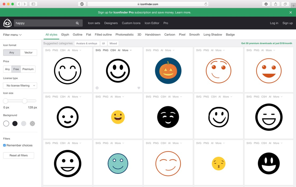 iconfinder 应该是大家最熟悉的一个 icon 素材网站了,这个网站有将近 200 万的 icon 素材,有免费和收费的 icon。只要将你想要寻找的 icon 关键词,输入到网站的搜索框进行搜索,说不定就能找到你心中理想的 icon 素材了。