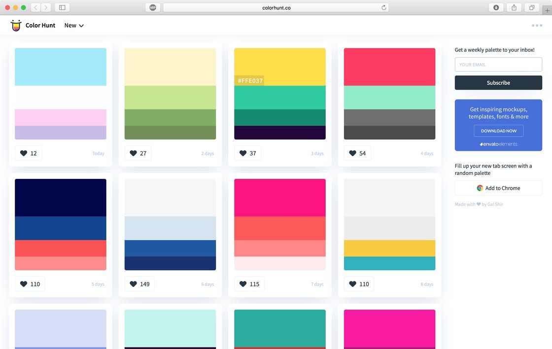 Color Hunt 是一个提供颜色搭配的网站,网站每天更新一个新的颜色搭配,同时你也可以查看最热门、最流行或者随机查看颜色搭配。当你自己做设计,却不知道要用什么颜色时,来这里看看说不定会有意外收获。