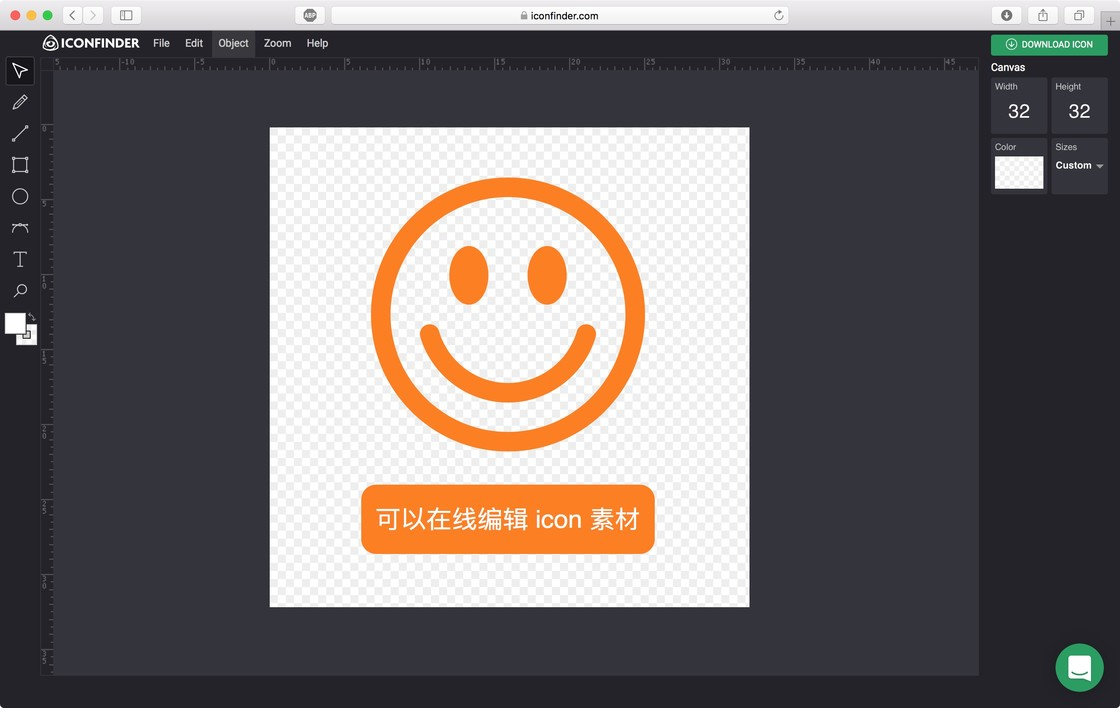 iconfinder 可以下载素材格式很多,其中包括最常用的矢量格式 SVG 和最常用的位图格式 PNG,而且,iconfinder 还推出了一个可以在线编辑 icon 的 icon editor 功能,可以将找到的素材,根据自己的需求,在线完成编辑。