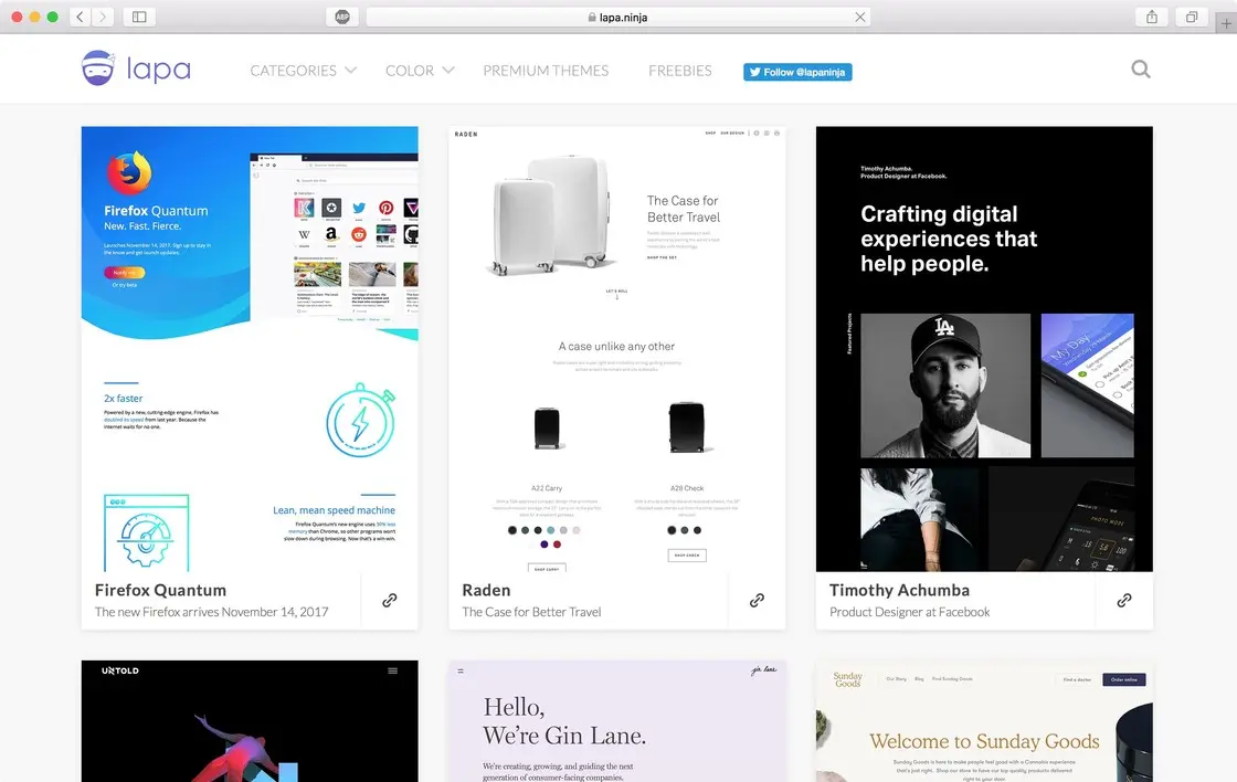 lapa 是一个可以查看优秀网页设计的网站,这个网站不仅展示了网页的截图,还收录了每个网站的链接,方便直接访问。网站支持通过颜色或者网站类型来筛选查看结果,方便寻找自己所需要的网站设计风格。