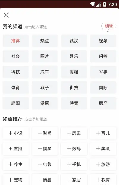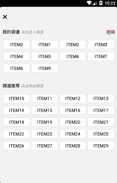 这一部分的实现就较为简单了,只需利用GridView展示频道,然后实现OnItemClickListener接口,点击时将该item移除并添加至我的频道视图中即可