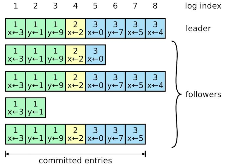 成功当选Leader的节点开始为客户端提供服务。客户端的每一个请求都包含一条被复制状态机执行的指令。leader把这条指令作为一条新的日志数据附加到日志中去,然后并行的发起附加数据以RPCs方式给其他的follower节点,让他们复制这条日志数据。当这条日志数据被绝大多数(N/2+1)follower节点接受时,leader会即刻将这条日志数据到它的状态机中然后把执行的结果返回给客户端。如果follower崩溃或者运行缓慢,再或者网络丢包,leader会不断的重复尝试附加日志数据RPCs(尽管已经回复了客户端)直到所有的follower都最终存储了该日志数据。