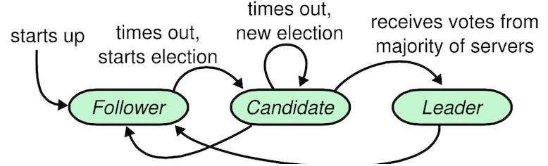 节点的角色有follower(跟随者)、candidate(候选人)、leader(领导)三种。初始的状态都是follower,节点与节点间通过心跳的方式进行通信,如果当下没有leader,则每个follower都会经过一个随机产生的时间后发起选举,同时升级为candidate,并通过广播的形式告知其他节点给自己投票(随机时间的目的是为了防止candidate数量太多)。经过一轮角逐后,票数最高的candidate节点成为了leader,而其他落选的candidate则降级成为follower。成功当选Leader的节点将即刻将自己当前还未落地的数据通过广播方式同步给其他follower节点。值得注意的是,leader永远只有1个或者没有leader。当投票结束且出现同票现象时,将重现进行新一轮选举。此外,当某个follower节点长时间没有收到leader的广播,则也会在一定时间后发起新的选举。