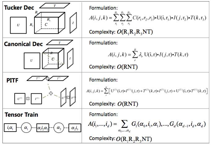 然而,二维平面的分析仅仅是我们理论研究的一块基石,而现实中的数据往往涵盖了多个维度。例如,在真实的推荐场景汇总,除了最为常见的用户和商品维度外,实际上还有时间、标签、查询、价格等诸多有价值的维度,充分利用及挖掘它们之间的潜在联系可以有效地了解用户真实的需求。N维(