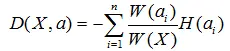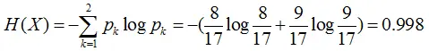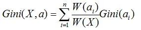 因为每个分支结点的个数不一样,因此我们计算“总熵”时应该做一个加权,假设第i个结点样本个数为W(ai),其在所有样本中的权值为W(ai) / W(X)。所以我们可以得到一个总熵: