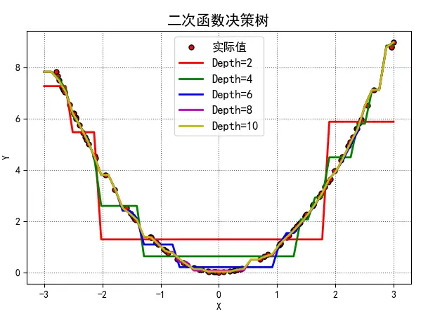训练数据是100个随机的真实的平方数据,不同的深度将会得到不同的曲线
